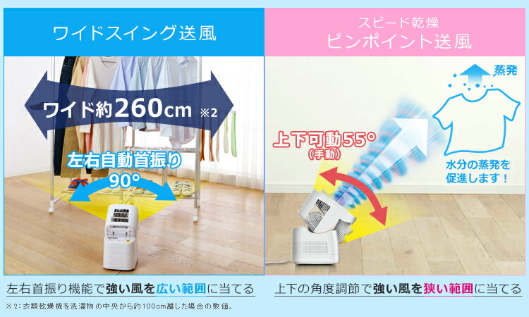 衣類乾燥モード(温風)3段階(速乾・標準・節電)と、送風モード3段階(静音・中・強)で調節ができます。