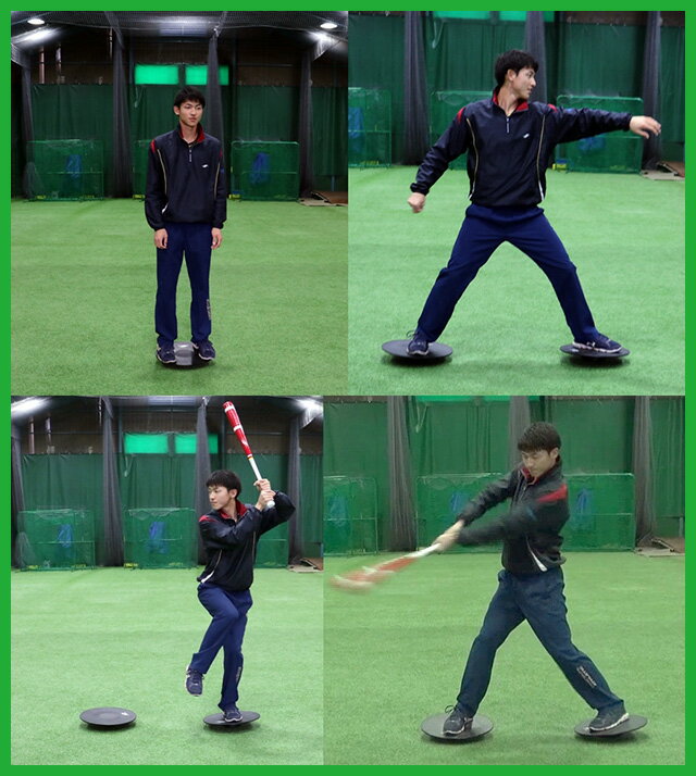 バランスボードの上で軸足のバランスをとりながらバッティングフォームを確認しましょう。