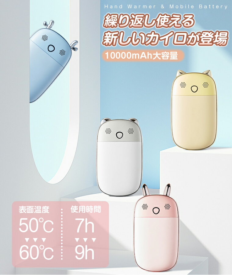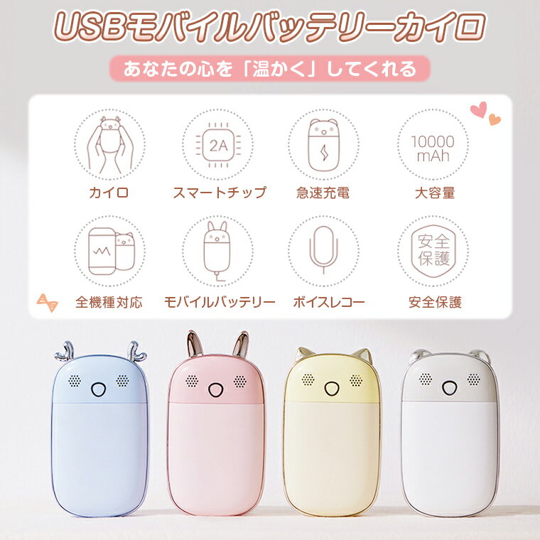 モバイルバッテリー カイロ 充電式 10000mAh 大容量 2A 急速充電 USB出力ポート Type-C ケーブル付き PSE認証済 スマホ充電 USBポート対応各機種 予備バッテリー ボイスレコーダー付 9時間 持ち運び 携帯充電器 旅行 通勤 通学 防災 省エネ 充電式カイロ 温度調節可