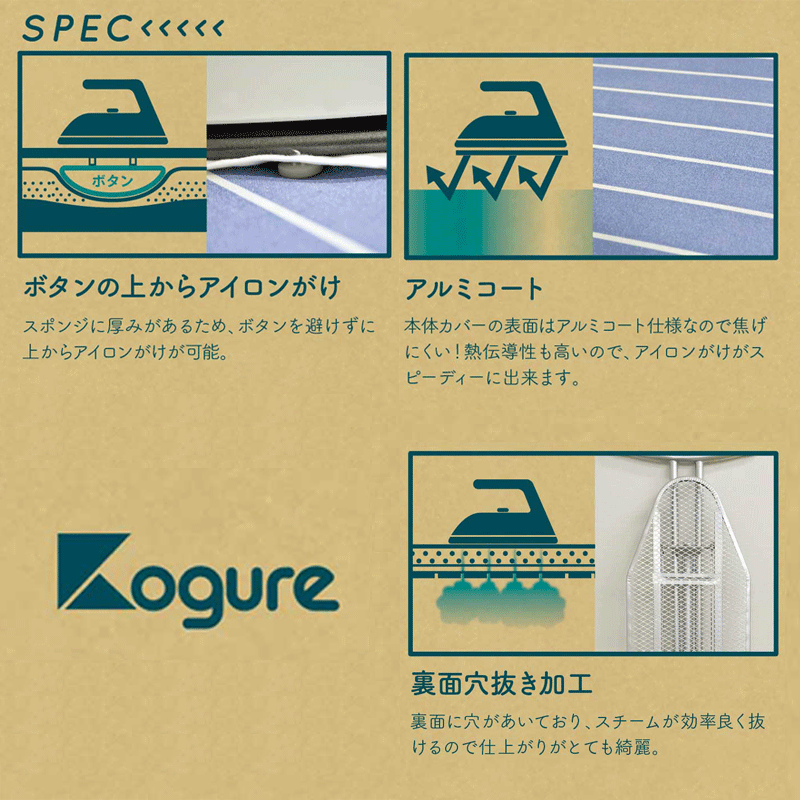 アルミコートされた表面は焦げにくく熱伝導率が高いので、スピーディーなアイロンがけが可能です。